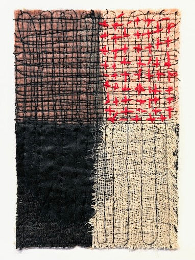 Patricia Kelly, Black Corner with Stitched Crosses and Madder, textile art, 10.5 x 15.5 cm (12.5 x 17.5 x 3 cm framed)