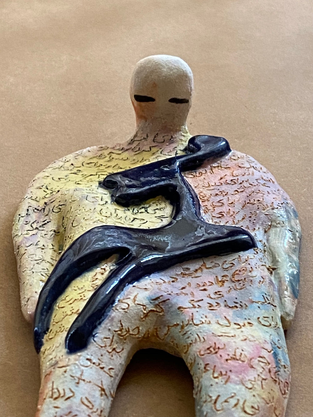 In a series of ceramic sculptures called ‘Docile Bodies’, Hemmat takes a stance against discrimination based on stereo-types as she highlights the uniqueness of each human being. She explains that ‘since the body represents the human, a symbol of an individual and the boundaries that separate him/her from other individuals, this project emphasises the diversity of the sculptures as having different shapes, colours, patterns, words and textures. These works have been based on studies on creation, mythology, gestation, images and sculptures from the Palaeolithic and Neolithic era, and primitive tribal art.'