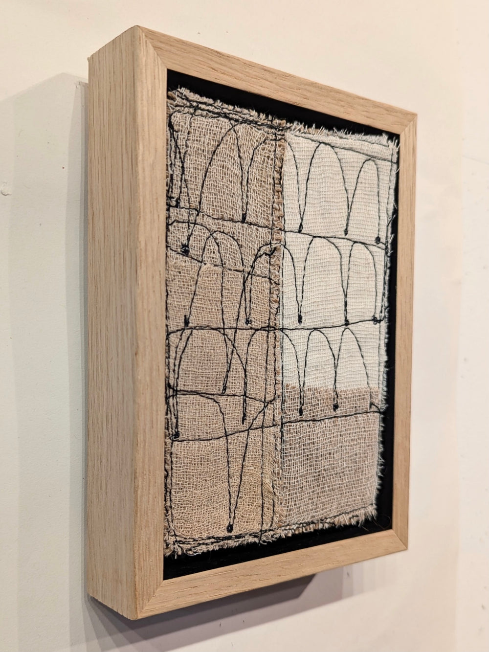 Patricia Kelly, Rows of Uplifting Lines with Hessian, textile art, 10.5 x 15.5 cm (12.5 x 17.5 x 3 cm framed) (Copy)