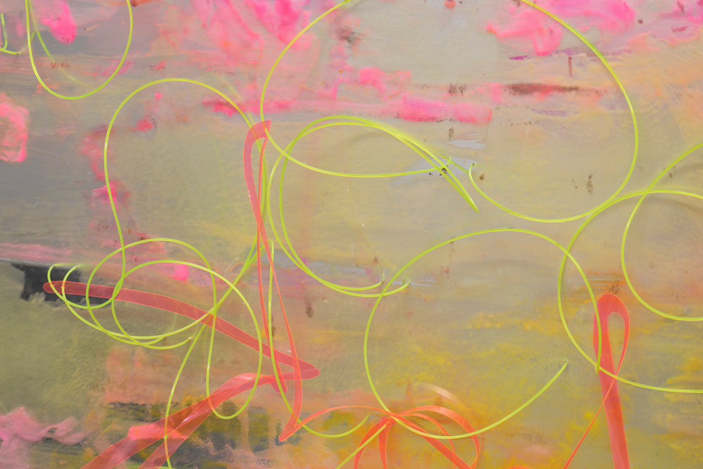 Media: acrylic and other media on mirrored plexiglass (nylon tubing, nail varnish, spray paint, ink, marker).