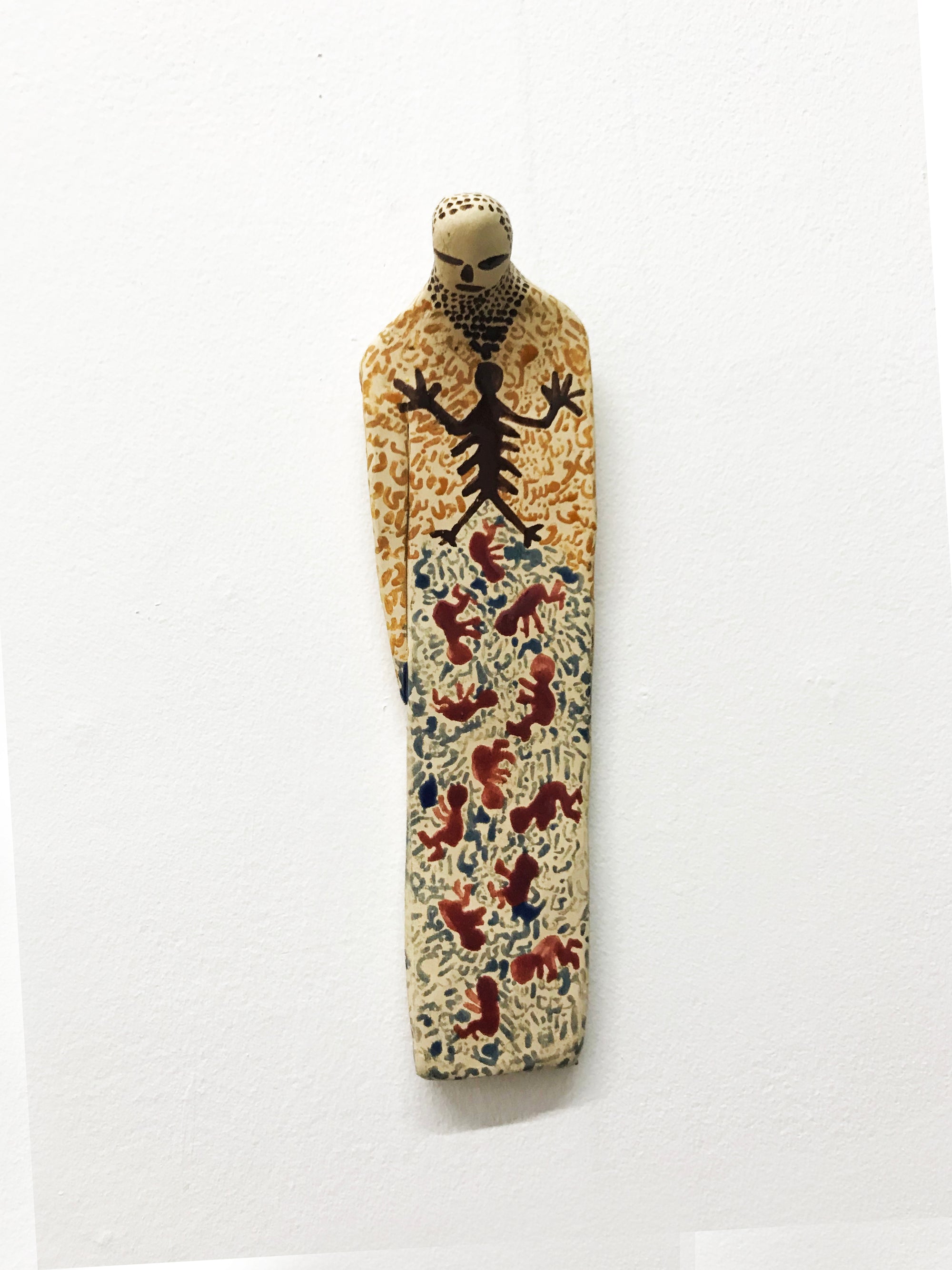 In a series of ceramic sculptures called ‘Docile Bodies’, Hemmat takes a stance against discrimination based on stereo-types as she highlights the uniqueness of each human being. She explains that ‘since the body represents the human, a symbol of an individual and the boundaries that separate him/her from other individuals, this project emphasises the diversity of the sculptures as having different shapes, colours, patterns, words and textures. These works have been based on studies on creation, mythology, gestation, images and sculptures from the Palaeolithic and Neolithic era, and primitive tribal art.’