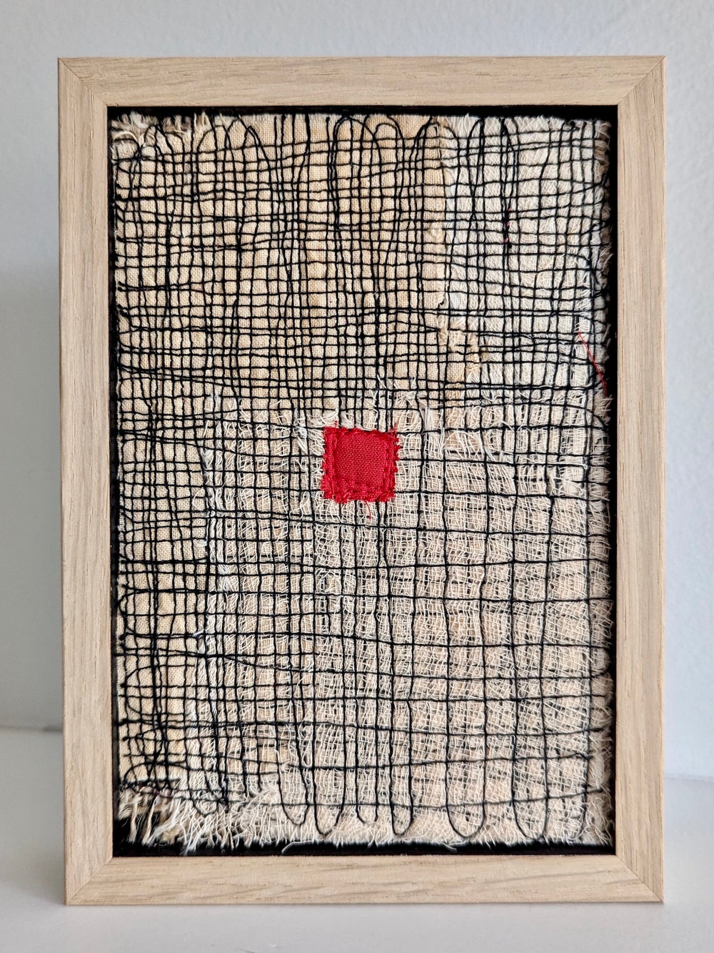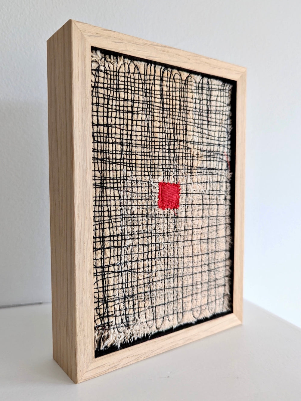 Patricia Kelly, Raked Hayfield with Red Square, textile art, 10.5 x 15.5 cm (12.5 x 17.5 x 3 cm framed)