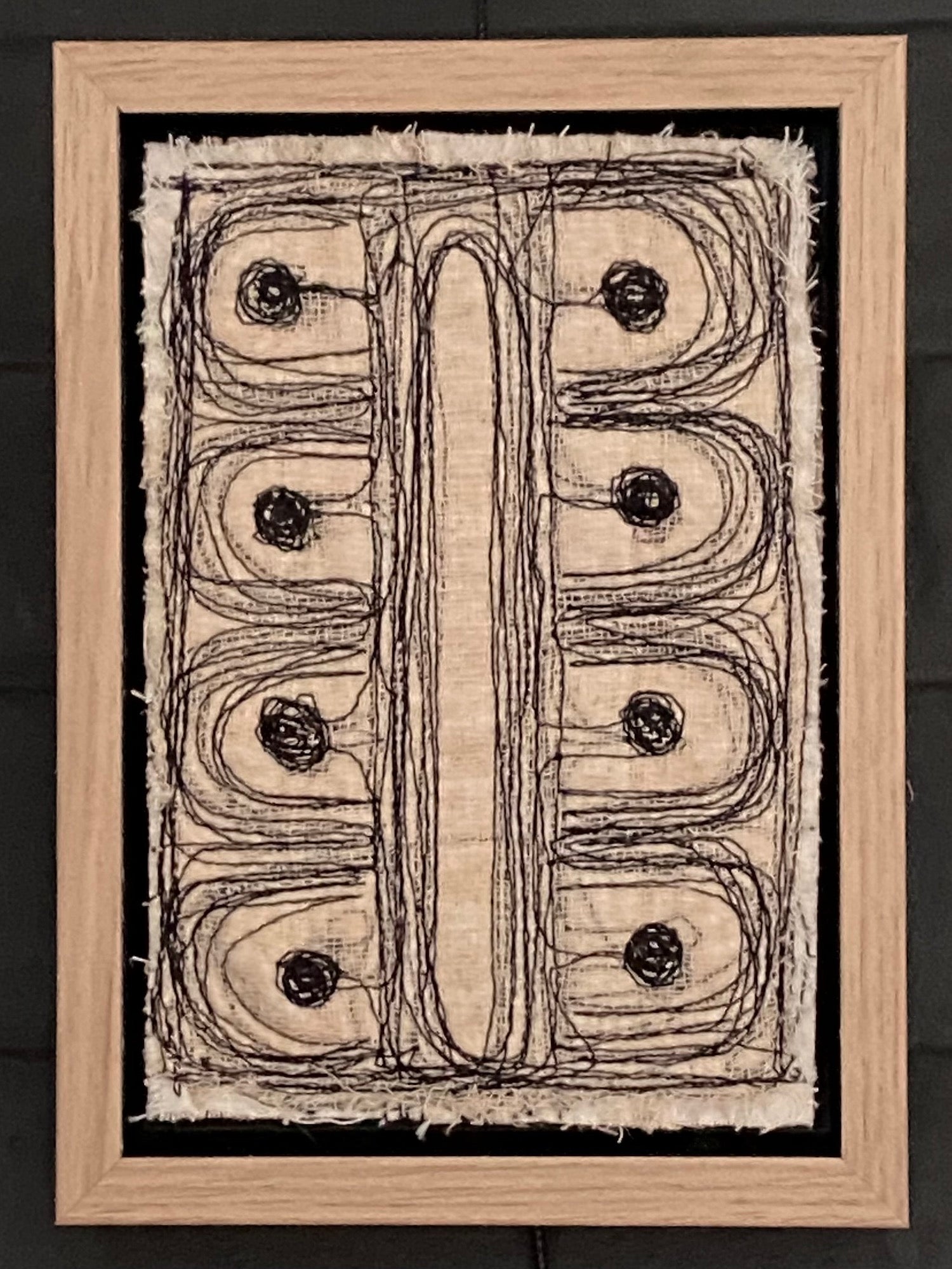 Patricia Kelly, Eight Black Dots, textile art, 10.5 x 15.5 cm (12.5 x 17.5 x 3 cm framed)