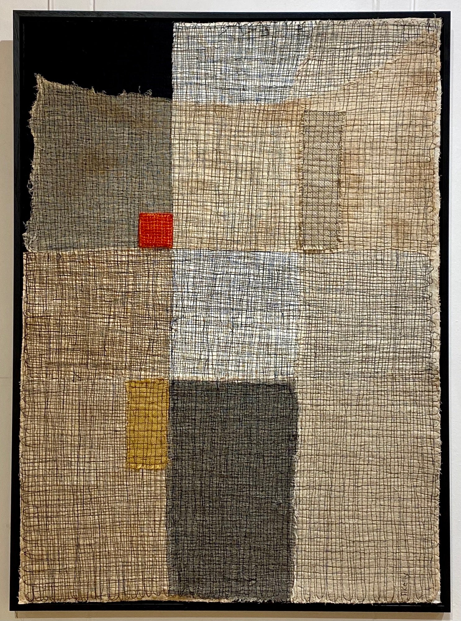 Patricia Kelly, Stitched Grid with Red Square Left, textile art, 64 x 90 cm (67.5 x 92 x 3 cm framed)