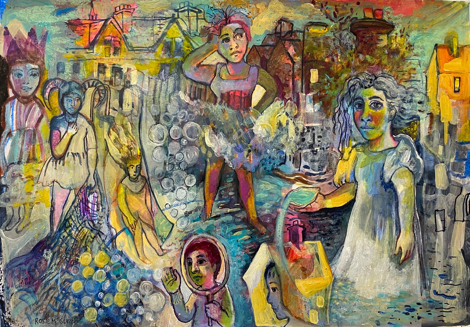 Part of Rosie McGurran’s solo exhibition ‘Corners of Time’ which presents an extraordinary series of new paintings inspired by the people and places of Belfast, moments of growth and transformation in her life, and imagined characters. Suspended between reality and fantasy, these artworks tell stories of the past – of the life in the city and of the artist, but above all stories of an imaginary world.