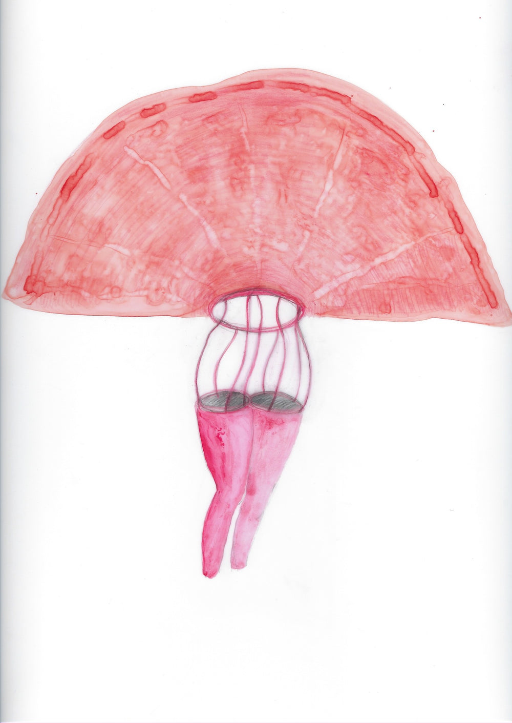 About this work: The image can be read as a reflection of joy, elation and a sort of emptying of oneself to the elements of life. The combination of a lack of ground and the translucent paper ground gives the image a floaty feeling as if the figure is about to depart…. The fan-like shape that veils the head and shoulders echos the historical use of fans by women and the coded hidden messages in their use.